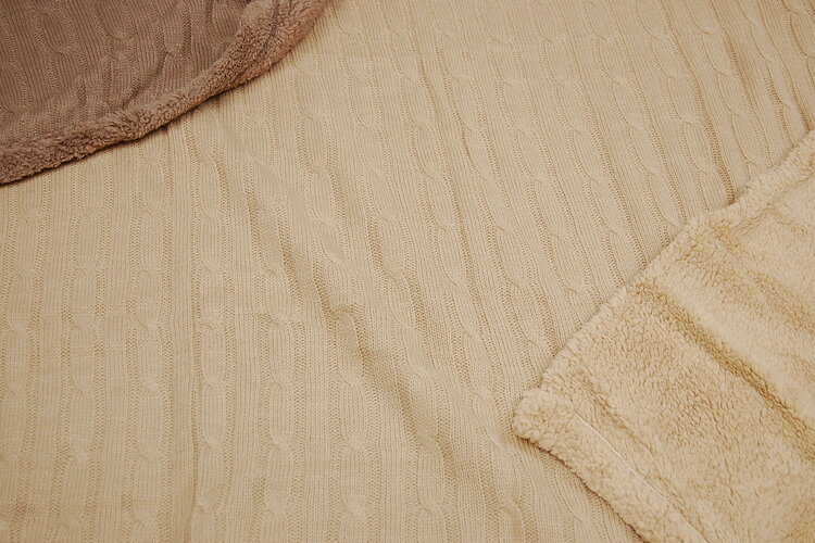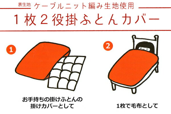 1枚2役 西川あったか掛けふとんカバー表ケーブルニット(アクリル毛糸)、裏マイクロシープ(もこもこフリース)毛布とふとんカバーが一緒になった「1枚2役」のあったかカバーです。